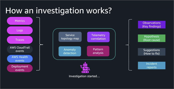 기존의 방식은 수많은 알림이 발생하면 여러 데이터(메트릭, 로그, 추적)를 찾아보고 근본 원인을 파악하는 데 많은 시간과 노력이 소요됩니다. 하지만 CloudWatch Investigation 기능을 통해 모든 원격 측정 데이터를 자동으로 스캔하고 상관관계를 파악하는 데 도움을 받을 수 있습니다.