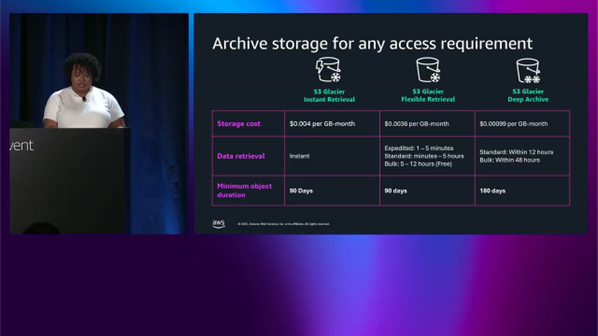 - Glacier Instant Retrieval: 밀리초 접근이 필요하지만 보관된 데이터에 적합합니다. (예: 의료 기록, 마감 기한이 촉박한 아카이브 클립, 규정 준수 요구 사항이 있는 데이터)