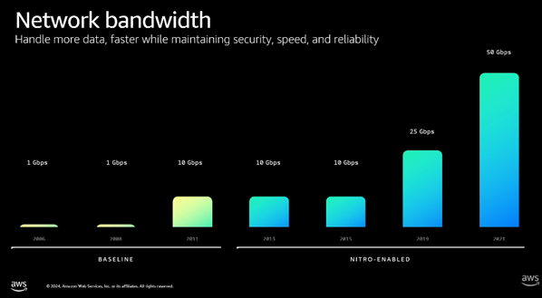AWS Nitro System은 가상화, 네트워킹, 암호화를 전용 하드웨어로 처리하여 인스턴스 자원을 소모하지 않습니다. 최신 Nitro v6 칩은 단일 칩에서 400Gbps 대역폭을 지속적으로 제공하며, 이전 세대(v5, 200Gbps) 대비 2배의 성능 향상합니다.