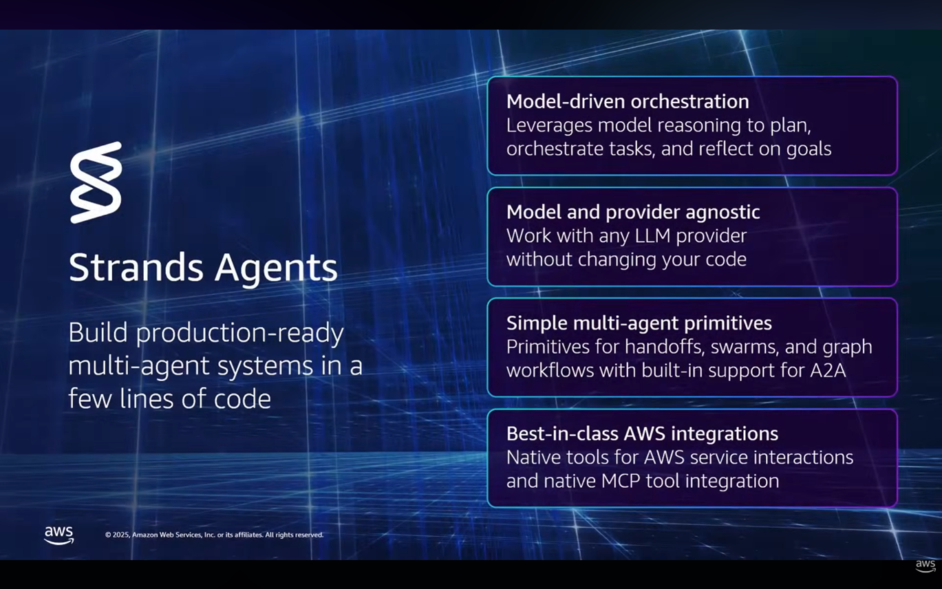 - Strands와 Agent Core는 엔지니어링에 몇 달이 걸리던 것을 몇 시간 내에 구축할 수 있는 완전히 관리 가능한 서비스 세트로 변환하여, 기존 시스템 수준 용어로 생각할 수 있게 하면서 추론과 자율성이 내장되도록 합니다.