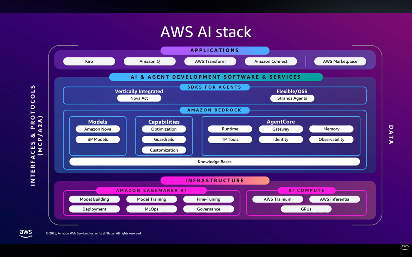 - 인프라 : SageMaker(Nova Forge 포함) 및 자체 제작 실리콘(Tranium 3 초고속 서버 포함)을 제공합니다.