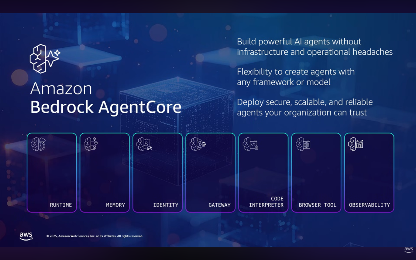 - Agent Core는 에이전트를 위한 관리형 엔터프라이즈급 런타임 플랫폼을 제공합니다.