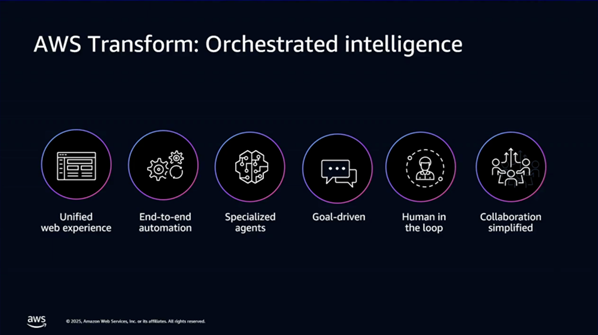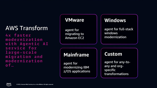 - 목표: AWS Transform은 에이전틱 AI를 통해 마이그레이션 및 현대화 문제를 해결하고 프로세스를 4배 가속화하는 데 중점을 둡니다.
