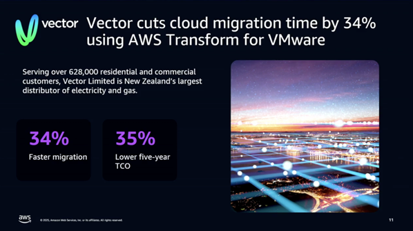 - Vector Limited 사례: 뉴질랜드의 에너지 회사인 Vector Limited는 AWS Transform for VMware를 사용하여 마이그레이션 시간을 20~34% 단축하고, 향후 5년간 총 소유 비용(TCO)을 35% 절감했습니다. 특히 웨이브 계획이 큰 도움이 되었습니다.