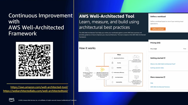 - AWS Well-Architected Framework: 클라우드 여정에서 기술 부채를 관리하고 워크로드를 최적화하는 데 도움이 되는 가이드형 도구입니다. 비용 최적화, 안정성 등 6가지 요소에 걸쳐 워크로드를 평가하고 고위험 결과에 대한 처방적 솔루션을 제공합니다.