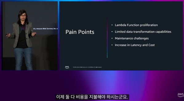 - 문제: Lambda 확산 (많은 Lambda 함수), 기존 Step Functions의 제한적인 데이터 변환 기능 (JSONPath), 유지 관리 문제 (CI/CD, 폐기 관리), 지연 시간 및 비용 증가